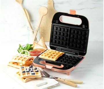 | Tento sendvičovač má také odnímatelné desky s nepřilnavým povrchem, což usnadňuje čištění a udržování, neboť desky lze umýt pod vodou. Navíc, díky nepřilnavému povrchu se sendviče nepřilepí k desce, což znamená, že je můžete snadno vyjmout a servírovat. O zapnutí spotřebiče a stejně tak o jeho nahřátí vás informuje kontrolka. Nechybí pojistka proti spuštění bez vložených pečicích desek. Bezpečné používání zajišťují protiskluzové nožičky. Pro uskladnění ve svislé poloze slouží zámek víka. Praktická je také konzole pro smotání přívodního kabelu. |  |