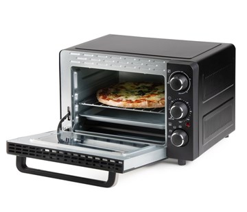 Elektrická pečící trouba s vnitřním objemem 20 litrů a možností horního ohřevu, spodního ohřevu, nebo kombinace obou. Nastavitelný termostat i časovač.