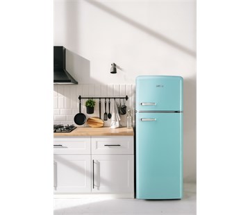 | Jedním z nejvýraznějších prvků retro lednice je její design. Kombinace retra s moderními prvky vytváří unikátní estetiku. Křivky, kulaté rohy a výrazná barva dávají této lednici nezaměnitelný vzhled, který okamžitě přitahuje pozornost. Díky pastelově tyrkysové barvě s výraznými kovovými madly s chromovou úpravou se vaše kuchyně stane místem plným šarmu a stylu. Přes její historickou podobu nejsou na místě obavy, že by zaostávala v technických parametrech, což dokazuje například energetická třída D, nízká hlučnost pouhých 39 dB nebo klimatická třída N, ST. |  |
