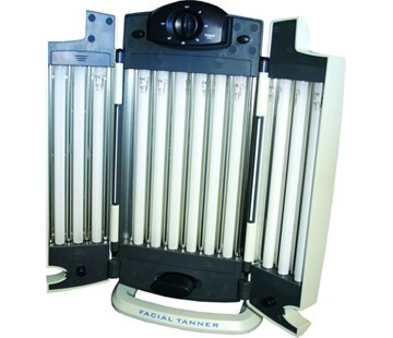 solárium na obličej a dekolt, boční skládací panely s vestavěnými pružinami, umožňuje optimálně nastavit úhel opalování, 30 minutový časovač s funkcí Auto Stop, bezpečnostní pojistky, příkon 200 W, ochranné brýle součástí balení