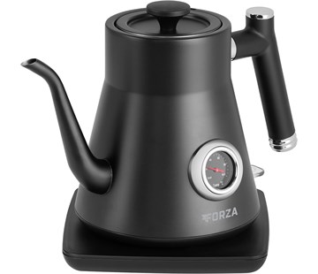 Pokud si svou kuchyň hýčkáte a chcete, aby v ní byl každičký prvek originálním designovým kouskem, rozhodně by vám neměla uniknout ani rychlovarná konvice ECG FORZA 5000 Pour Over Nero. Tento sympatický malý spotřebič jsme totiž navrhli tak, aby vám spolehlivě sloužil, ale zároveň byl i ozdobou domácnosti. Přisoudili jsme mu proto prémiový design s husím krkem, matnou černou povrchovou úpravou a stylovým analogovým teploměrem – vzhled, který upoutá vaši pozornost, hned jak vejdete do místnosti. Objem této designové konvice je 0,8 litru, připojovací kabel měří dostatečných 70 cm a příkon spotřebiče činí 1000–1200 W. |