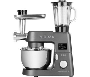 kuchyňský robot • příkon 1500 W • 6,5l nerezová pracovní mísa • 6 stupňů rychlosti + pulzní stupeň • vhodný pro šlehání, míchání, hnětení, mixování, sekání, mletí, plnění klobás, strouhání, drcení ledu • planetární míchání • 1,5l skleněný mixér • hlučnost 68 dB • příslušenství – hák na těsto, šlehací hák a šlehací metla z nerezové oceli, mlýnek na maso se 3 vyměnitelnými disky, nástavec na plnění uzenin a kebbe, bubnové struhadlo • dotykové ovládání • celokovové převody • LED displej • 115cm přívodní kabel • bezpečnostní pojistka • protiskluzové podložky • časovač • rozměry: 32,5×40,2×24,5 cm • hmotnost 9 kg • záruka 5 let na motor po registraci