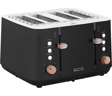 topinkovač • pro 4 ks topinek • 7 stupňů ohřevu • černý nerezový design s dřevěnými prvky • plynulá regulace • pro přípravu tenkých i silnějších toastů • integrovaná mřížka na rozpékání pečiva • funkce rozmrazování a přihřívání • automatické centrování pro rovnoměrné opékání • automatické vypnutí přístroje a vysunutí pečiva • vyjímatelná zásuvka na drobky • tepelně izolované stěny • protiskluzové nožky • délka přívodního kabelu 100 cm • příkon 1550–1850 W