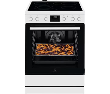 elektrický sporák • nízká energetická náročnost • 4 varné zóny • objem trouby 73 l • sklokeramická varná deska • max. příkon 10 300 W • připojení k síti 230 V • otočné zasouvatelné knoflíky • zásuvka pro skladování plechů • černý smalt • gril • funkce AirFry • pečení na více úrovních • LED displej • časovač • 85×59,6×60 cm