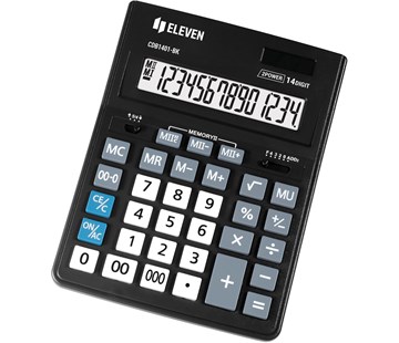 Stolní kalkulačka: 14 mísný displej, 4 tlačítka paměti : MC, MR, M+, M-, výpočet marže [MU], Zaokrouhlování, Odmocnina [?], Dvě paměti [MII], Změna [+/-], Desetinná čárka, Procenta [%], Dvojitá nula [00], Dvojí napájení: battery & solar