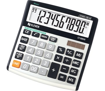 Stolní kalkulačka: 10 místný displej, 3 paměťové klávesy: MRC, M+, M-, Výpočet marže [MU], Odmocnina [?], Procenta [%], Změna [+/-], Dvojitá nula [00], Výpočet DPH [TAX], Check & correct (99 steps), Dvojí napájení: battery & solar