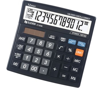 Stolní kalkulačka: 12 místný displej, 3 paměťové klávesy: MRC, M+, M-, Výpočet marže [MU], Odmocnina [?], Procenta [%], Dvojitá nula [00], Výpočet DPH [TAX], Check & correct (120 steps), Dvojí napájení: battery & solar