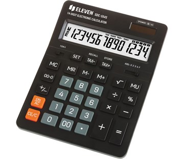 Stolní kalkulačka: 14 místný displej, 4 paměťové klávesy: MC, MR, M+, M-, Výpočet marže [MU], Odmocnina [?], Změna [+/-], Mazání, Desetinná čárka, Procenta [%], Dvojitá nula [00], Výpočet DPH [TAX], Dvojí napájení: battery & solar