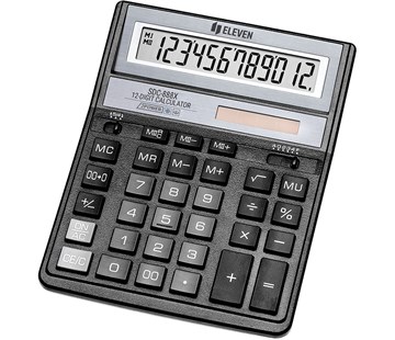 Stolní kalkulačka: 12 místný displej, 4 paměťové klávesy: MC, MR, M+, M-, Výpočet marže [MU], Odmocnina [?], Změna [+/-], Mazání, Desetinná čárka, Procenta [%], Zaokrouhlování, Dvojitá nula [00], Dvojí napájení: battery & solar