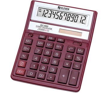 Stolní kalkulačka: 12 místný displej, 4 paměťové klávesy: MC, MR, M+, M-, Výpočet marže [MU], Odmocnina [?], Změna [+/-], Mazání, Desetinná čárka, Procenta [%], Zaokrouhlování, Dvojitá nula [00], Dvojí napájení: battery & solar