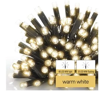 produkt krápníky, barva světla teplá bílá, rozměr 3 × 0,4 m,venkovní i vnitřní, dálkový ovladač ne, funkce svítí/bliká, typ napájení síťový adaptér (není součástí balení), počet LED 50, LED mezera 10 cm, velikost LED 7 mm, délka přívodu 10 cm, krytí IP44, materiál guma, záruční doba 3 roky