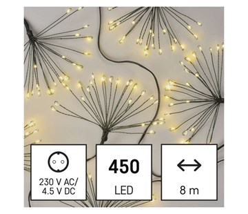produkt řetěz, barva světla teplá bílá, rozměr 8 m, použití vnitřní, časovač , dálkový ovladač ne, funkce svítí, typ napájení síťový adaptér, tvar nano, počet LED 450, velikost LED 3 mm (nano), délka přívodu 3 m, pro výšku stromu neuvádí se, barva drátu zelená, příkon 6 W,