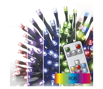 produkt řetěz, barva světla RGB, rozměr 12 m, použití venkovní i vnitřní, časovač , dálkový ovladač ano (CR2032), funkce 72 módů, typ napájení síťový adaptér, tvar klasický, počet LED 120, LED mezera 10 cm, velikost LED 5 mm, délka přívodu 3 m, pro výšku stromu 170 cm, barva drátu černá,
