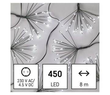 produkt řetěz, barva světla studená bílá, rozměr 8 m, použití vnitřní, časovač , dálkový ovladač ne, funkce svítí, síťový adaptér, tvar nano, počet LED 450, velikost LED 3 mm (nano), délka přívodu 3 m, barva drátu zelená, příkon 6 W, vstupní napětí 230 V AC, výstupní napětí 4,5 V krytí IP20