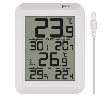 provedení teploměru drátový, vnitřní teplota 0 °C až +60 °C, venkovní teplota -40 °C až +60 °C, možnost nastavení jednotky teploty °C/°F, min. a max. teplota , sonda k čidlu 0,9 m, možnost pověšení na zeď , napájení stanice 2× 1,5 V, rozměr hlavní jednotky 19 × 58 × 75 mm, krabička, záruka 2 roky