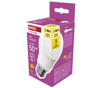 barva světla: teplá bílá|energetická třída: E|index podání barev (CRI): 80|náhrada za žárovku: 50 W|napětí: 230 V~/50 Hz|patice (uchycení žárovky): E27|počet čipů: neuvádí se|počet spínacích cyklů: 30 000|příkon: 5,8 W|prodejní obal: 1 ks, krabička|řada: CLASSIC|rozměr: