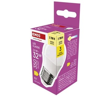 barva světla: teplá bílá|energetická třída: D|index podání barev (CRI): 80|náhrada za žárovku: 32 W|napětí: 230 V~/50 Hz|patice (uchycení žárovky): E27|počet čipů: neuvádí se|počet spínacích cyklů: 30 000|příkon: 2,5 W|prodejní obal: 1 ks, krabička|řada: CLASSIC|rozměr: