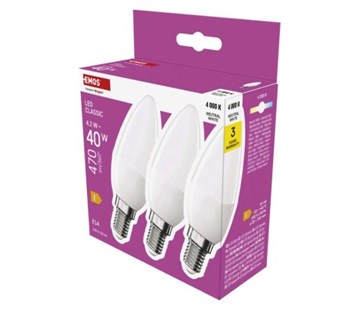 barva světla: neutrální bílá|energetická třída: E|index podání barev (CRI): 80|kompatibilita: –|náhrada za žárovku: 40 W|napětí: 230 V~/50 Hz|notifikace do mobilní aplikace: ne|ovládání hlasovými asistenty: ne|patice (uchycení žárovky): E14|počet čipů: neuvádí se|počet spínacích cyklů: 30 000|podporované OS: –|přenosová frekvence: –|příkon: 4,2 W|prodejní obal: 3 ks, krabička|protokol: –|řada: CLASSIC|rozměr: 35 × 35 × 103 mm|stmívatelná: ne|světelná účinnost: 112 lm/W|světelný tok: 470 lm|technologie: LED|teplota chromatičnosti: 4 000 K|tvar: svíčka|typ čipů: SMD|účiník: 0,50|úhel vyzařování: 240°|záruční doba: 3 roky|životnost: 30 000 hodin