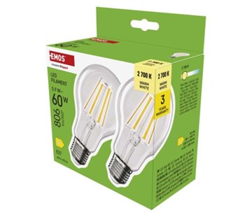 barva světla: teplá bílá|energetická třída: D|index podání barev (CRI): 80|kompatibilita: –|náhrada za žárovku: 60 W|napětí: 230 V~/50 Hz|notifikace do mobilní aplikace: ne|ovládání hlasovými asistenty: ne|patice (uchycení žárovky): E27|počet čipů: 4|počet spínacích cyklů: 25 000|podporované OS: –|přenosová frekvence: –|příkon: 5,9 W|prodejní obal: 2 ks, krabička|protokol: –|řada: FILAMENT|rozměr: 108 × 60 × 60 mm|stmívatelná: ne|světelná účinnost: 137 lm/W|světelný tok: 806 lm|technologie: LED|teplota chromatičnosti: 2 700 K|tvar: A60|typ čipů: COB|účiník: 0,50|úhel vyzařování: 360°|záruční doba: 3 roky|životnost: 25 000 hodin