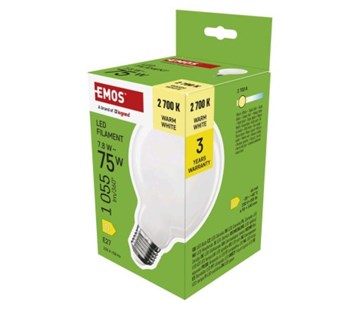 barva světla: teplá bílá|energetická třída: D|index podání barev (CRI): 80|kompatibilita: –|náhrada za žárovku: 75 W|napětí: 230 V~/50 Hz|notifikace do mobilní aplikace: ne|ovládání hlasovými asistenty: ne|patice (uchycení žárovky): E27|počet čipů: 4|počet spínacích cyklů: 25 000|podporované OS: –|přenosová frekvence: –|příkon: 7,8 W|prodejní obal: 1 ks, krabička|protokol: –|řada: FILAMENT|rozměr: 95 × 95 × 140 mm|stmívatelná: ne|světelná účinnost: 135 lm/W|světelný tok: 1 055 lm|technologie: LED|teplota chromatičnosti: 2 700 K|tvar: G95|typ čipů: COB|účiník: 0,50|úhel vyzařování: 360°|záruční doba: 3 roky|životnost: 25 000 hodin