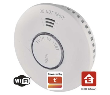 detektor kouře, typ instalace montáž na zeď nebo volně stojící, signalizace optická i zvuková, signalizace >85 dB ve vzdál. 3 m, provozní teplota 0 °C až 40 °C, životnost 10 let, krytí IP20, napájení 2× 1,5 V AA, OS Android, iOS, kompatibilita EMOS GoSmart, TUYA, LIDL, aplikace ano, záruka 2 roky