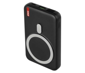 | Při nabíjení kompatibilních telefonů se také nemusíte zdržovat s hledáním a zapojováním kabelu. Powerbanka je vybavena funkcí bezdrátového nabíjení o výkonu až 15 W. Je také je kompatibilní s nejnovější patentovanou technologií MagSafe od Apple. Takto vybavené telefony se díky magnetu snadno přichytí k povrchu powerbanky a docílí tak snadného a stabilního spojení během nabíjení. Během toho můžete využít praktický stojánek na zadní části powerbanky. |