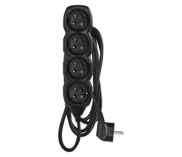 délka 3 m, počet zásuvek 4, max. zátěž 3 680 W, napětí 250 V~, proud 16 A max., průřez vodiče 1,5 mm2, barva černá, vodič H05VV-F3G, materiál zásuvky a vidlice plast, typ izolace PVC, krytí IP20, dětské clonky , záruční doba 2 roky, prodejní obal 1 ks, závěs