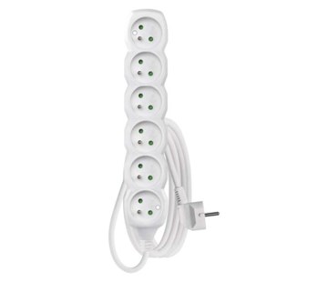 délka 3 m, počet zásuvek 6, max. zátěž 3 680 W, napětí 250 V~, proud 16 A max., průřez vodiče 1,5 mm2, barva bílá, vodič H05VV-F3G, materiál zásuvky a vidlice plast, typ izolace PVC, krytí IP20, dětské clonky , záruční doba 2 roky, prodejní obal 1 ks, závěs