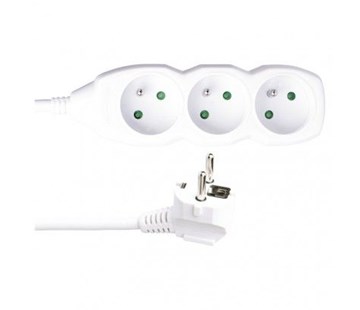 délka 3 m, počet zásuvek 3× 2P + PE, max. zátěž 3 680 W, typ izolace PVC, barva bílá, dětské clonky ano, záruční doba 2 roky