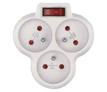 produkt rozbočovací zásuvka 3× s vypínačem, typ FRENCH, napětí/proud 250 V~/10 A max., max. zátěž 2 300 W, barva bílá, vypínač , dětské clonky , krytí IP20, materiál plast, počet zásuvek 3× 2P + PE, prodejní obal 1 ks, závěs, záruční doba 2 roky