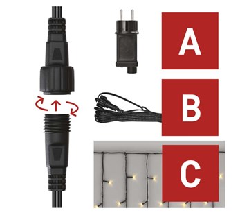 krápníky, barva světla teplá bílá, rozměr 2,5 × 0,9 m, venkovní i vnitřní, časovač ,  síťový adaptér, počet LED 100, délka přívodu 5 m, barva drátu černá, příkon max. 12 W, vstupní napětí 230 V AC, výstupní napětí 30 V DC, možnost propojení ano, krytí IP44,   materiál PVC, záruka2 roky
