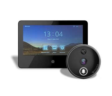 digitální kukátko • kamera s rozlišením 2 Mpx • úhel záběru 150/180° • PIR senzor pro detekci pohybu • infračervený přísvit pro snímání v noci • barevný LCD displej s uhlopříčkou 5.5" • Wi-Fi • lithiový akumulátor s kapacitou 8000 mAh • obousměrný audio přenos pro vzdálenou komunikaci s návštěvníkem u dveří