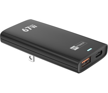 ER Power adaptér s výkonem 67W je poháněn technologií GaN. GaN .Disponuje portem USB-C a portem USB-A v balení navíc naleznete vyměnitelné UK a EU vidlice, které v případě potřeby umístíte na US vidlici, která je v nabíječce integrována.