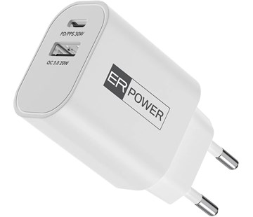 ER Power kompaktní síťový adaptér se dvěma porty a podporou rychlonabíjení Power Delivery a Quick Charge, který vám umožní dobíjení dvou zařízení současně.Síťový adaptér s výkonem 30W vám umožní dobíjení dvou zařízení současně za pomoci portů USB-A a USB-C.