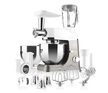 kuchyňský robot • příkon 1200 W • 2 nerezové pracovní mísy o kapacitě 5,5l • 6 stupňů rychlosti • funkce PULSE • vhodný pro šlehání, míchání, hnětení, mixování, mletí, strouhání • planetární systém míchání • plynulá regulace otáček • příslušenství – šlehací metla, míchací metla, hnětací hák, skleněný mixér o objemu 1,5 l, brousek na nože, mlýnek na maso o průměru 54 mm, strouhací nástavec se 4 struhadly • hmotnost 11,08 kg