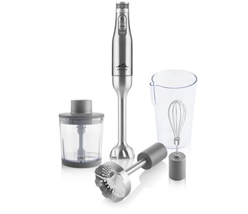 tyčový mixér • 1200 W • DC motor s dlouhou životností • kombinace nerezového provedení a kvalitního plastu • seká, šlehá, pasíruje a mixuje maso, zeleninu i další přísady • plynulá regulace otáček • Turbo • světelná signalizace provozu • délka přívodního kabelu 1,2 m • poutko na zavěšení • přislušenství: nerezová šlehací metla, nástavec na bramborovou kaši, sekáček, 600ml nádoba