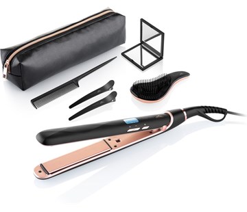 žehlička na vlasy • keramická žehlicí plocha • teplota 150 až 230 °C • rychlé nahřátí • možnost uzamčení žehlicích ploch • poutko na zavěšení • funkce automatického vypnutí • LED displej • délka otočného napájecího kabelu 1,69 m • příslušenství – kartáč na vlasy, hřeben, klipy na vlasy, zrcátko, ochranné pouzdro