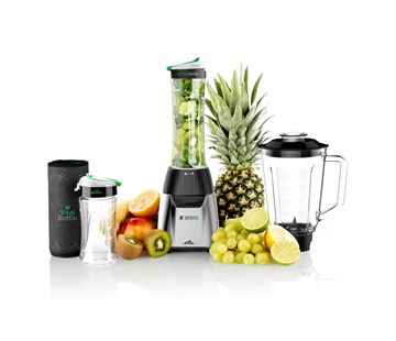 Lahve slouží zároveň i jako mixovací nádoby, které naplníte a jednoduše nasadíte na mixovací nože. Po rozmixování všech surovin lahev odejmete a nože vyměníte za těsnicí víčko s pítkem. Díky tomu tak nemusíte ztrácet čas s přeléváním obsahu do jiné nádoby a mytím dalších nádob navíc. Součástí výbavy je také 1l skleněná nádoba a neoprenový obal na lahve, který slouží pro udržení stálé teploty.