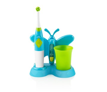 Bateriový zubní kartáček, BATERIE: 2x AAA, Oscilační pohyb (4500 kmitů za minutu), Voděodolné provedení kartáčku, PŘÍSLUŠENSTVÍ: Odkládací stojánek s dekorací, přesýpací hodiny (cca 2 minuty), pohárek na vodu, BARVA: modrá