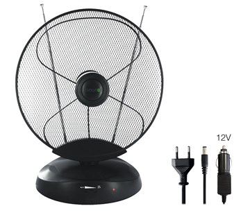 Aktivní pokojová anténa, pro příjem FM/DAB+/DVB-T2, zesilovač, zisk 50 dBi, filtr LTE, 4G, 5G, napájecí adaptér, konektor IEC male