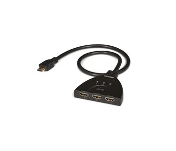 HDMI přepínač, 3x vstup 1x výstup, kompatibilní s Full HD 1080p, 3D, funkce inteligentního automatického výběru při detekci vstupního signálu, nebo ruční volba vstupu, šířka pásma 7,5 Gbps, výstup kabel 50 cm, indikátor vstupu LED