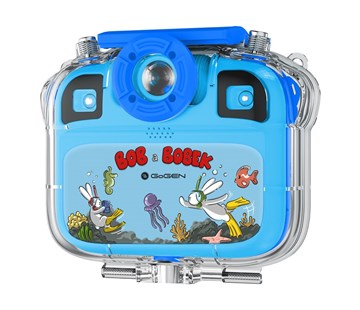 dětský fotoaparát s vodotěsným pouzdrem; 12 Mpx; 5 x digitální zoom; Full HD video (1920 × 1080 px); fotografické efekty - vtipné rámečky; podporované Micro SD karty; LED přisvětlení; selfie kamera; odolnost IP68; barva modrá; rozměry 105x90x40 mm; hmotnost 230 g