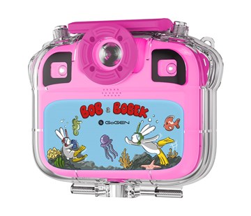 dětský fotoaparát s vodotěsným pouzdrem; 12 Mpx; 5 x digitální zoom; Full HD video (1920 × 1080 px); fotografické efekty - vtipné rámečky; podporované Micro SD karty; LED přisvětlení; selfie kamera; odolnost IP68; barva růžová; rozměry 105x90x40 mm; hmotnost 230 g