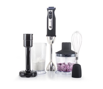 tyčový mixér • motor s výkonem 1000 W • rychlost až 15 tisíc otáček za minutu • nerezová mixovací tyč • 0,6ml plastová nádoba • 13 úrovní otáček • vhodný pro mixování, šlehání, sekání • tlačítko TURBO • unikátní technologie 3D Quattro Blade pro důkladné mixování • 1,4m přívodní kabel • příslušenství – nerezový tyčový nástavec, 0,6l nádoba na mixování a šlehání, nerezová šlehací metla, nástavec na výrobu pyré, nádoba na sekání s kapacitou 0,5 l, stojan na příslušenství