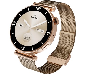 chytré hodinky • 1,32" AMOLED displej (rozlišení 466×466 px) • Bluetooth 5.3 • smart notifikace • funkce Always on Display • hlasový asistent • mobilní aplikace Garett Smart • senzor tepové frekvence • výpočet spálených kalorií • monitorování denní aktivity a spánku • monitorování menstruačního cyklu • režimy pro 78 aktivit • kalendář • budík • stopky • výdrž až 7 dní • vodotěsnost IP67 • 2 vyměnitelné řemínky (ocelový řemínek, kožený řemínek) • barva: růžové zlato