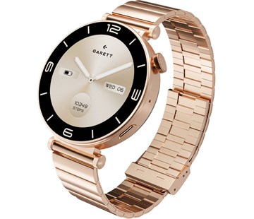 chytré hodinky • 1,32" AMOLED displej (rozlišení 466×466 px) • Bluetooth 5.3 • smart notifikace • funkce Always on Display • hlasový asistent • mobilní aplikace Garett Smart • senzor tepové frekvence • výpočet spálených kalorií • monitorování denní aktivity a spánku • monitorování menstruačního cyklu • režimy pro 78 aktivit • kalendář • budík • stopky • výdrž až 7 dní • vodotěsnost IP67 • 2 vyměnitelné řemínky (ocelový řemínek, kožený řemínek) • barva: růžové zlato