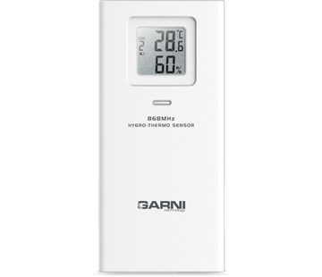 Sedmikanálové bezdrátové čidlo pro měření teploty a relativní vlhkosti, určeno pro Wi-Fi meteorologickou stanici GARNI 3015 Arcus, GARNI 2055 Arcus, GARNI 1085 Arcus, GARNI 975, GARNI 1025 Arcus, GARNI 925T, hobby meteostanici GARNI 750 a chytrý digitální teploměr s vlhkoměrem GARNI 419T.