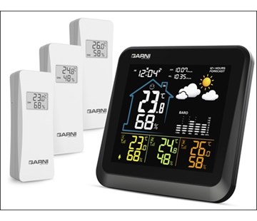 | Elegantní přístroj jménem Garni 502 vám po celý rok zajistí skvělý přehled o počasí. Jde o meteorologickou stanici, která vás přehledně informuje o teplotě a relativní vlhkosti, a to v místnosti i venku. Sestává totiž z interiérové ústředny a 3 vnějších bezdrátových čidel, jejichž prostřednictvím můžete sledovat teplotu a vlhkost v exteriéru. Vnitřní základna meteostanice navíc umožňuje i měření absolutního barometrického tlaku. Zařízení vás potěší i stylovým designem, díky němuž se stane i zajímavým estetickým prvkem vašeho obýváku. Černé rámování ukrývá inverzní barevný VA displej o rozměrech 106 × 94 mm, který umožňuje stálé osvětlení (při napájení síťovým adaptérem), nebo krátkodobé osvětlení na 10 sekund (při napájení bateriemi). Jas displeje je možné regulovat ve třech stupních. |
