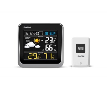 Meteorologická stanice se špičkovým inverzním barevným VA displejem s časem a datem řízenými rádiovým signálem DCF-77, budíkem, měřením vnitřní teploty, relativní vlhkosti a absolutního barometrického tlaku a bezdrátovým čidlem pro měření vnější teploty a relativní vlhkosti.