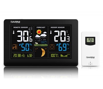 meteostanice • barevný VA displej • čas řízený rádiovým signálem DCF-77 • budík • měření vnitřní a venkovní teploty, relativní vlhkosti a absolutního barometrického tlaku • 6 animovaných ikon předpovědi počasí • bezdrátové čidlo pro měření vnější teploty a relativní vlhkosti • lze připojit až 3 čidla • čas a datum řídí signál DCF-77 • USB port (pro nabíjení externích zařízení) • napájení hlavní jednotky (síťový adaptér, 2 kusy baterií typu AA), napájení čidla (2 kusy baterií typu AA), baterie je nutné zakoupit samostatně